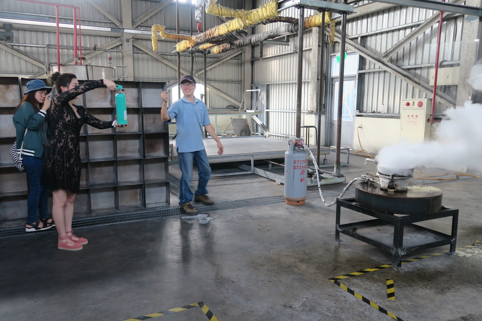 在聽完講座簡報後,興奮的時間到了,我們一起出發去實驗日本KUMA熊滅火器的威力。這個地方並不是在公司內,而是特別的滅火器實驗點,透過說明才知道滅火器的功能效用都必須在合格的試驗場所按照規定的方式實驗能安全滅火才行。